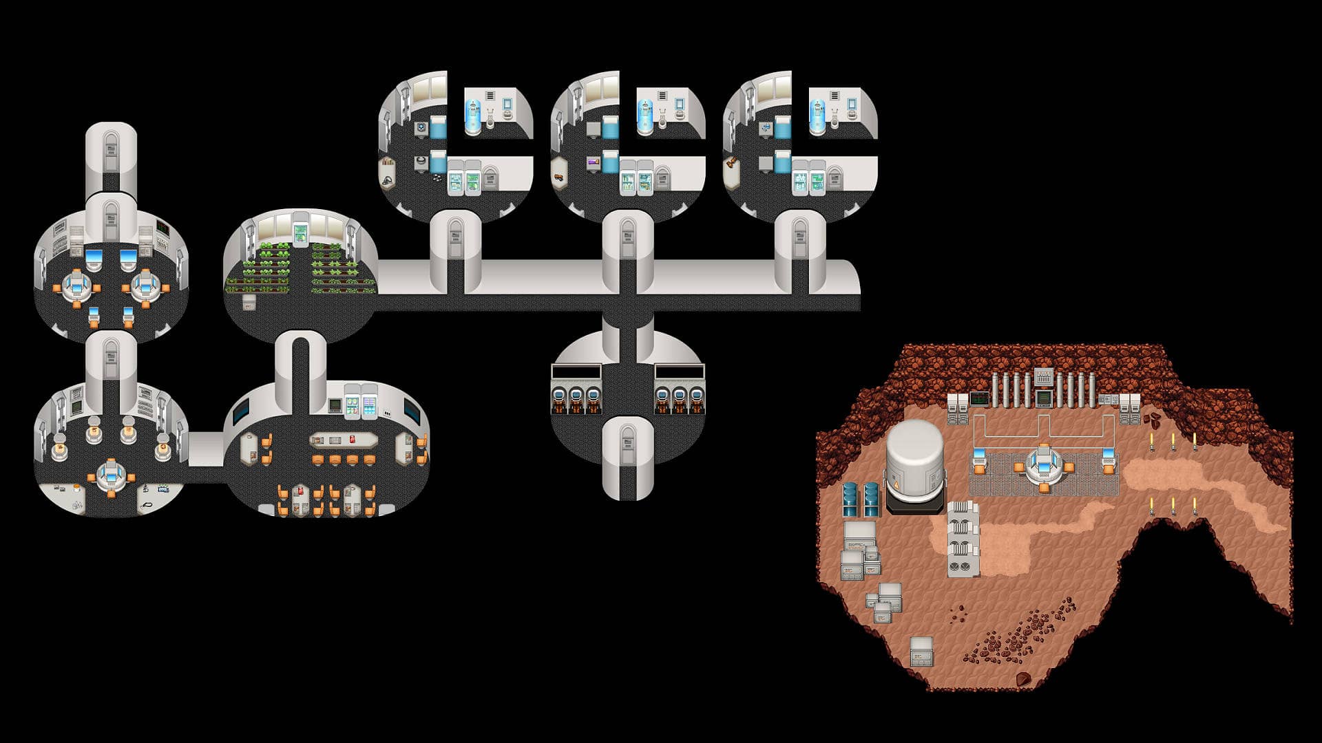 <イベントとアニメーション> ・ベイドア(内部と外部が透けて見えるバージョン、明暗のバリエーションあり。必要に応じて独自の透明バージョンも作成可能です) ・エレベータープラットフォーム ・小型探査車 ・大型輸送車両(ハッチが開閉するバージョンあり) ・ドア - 背の高いものと低いもの複数のバージョンに加え、廊下のカーブに合うサイドドアも付属。 ・アニメーションスーツ - RPGツクールRTPに対応したバージョン(48px)と、やや大きめのキャラクターベースを使用する場合に便利な背の高いバージョン(62px)が含まれています。(スクリーンショットには背の高いバージョンが表示されています)