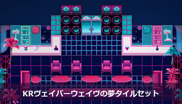 ※この商品はダウンロード商品です。 80年代のちょっとふしぎな美的センスの世界へ突入です♪ ネオンに照らされたゲームマップは夢の中のようです。ヤシの木とそれに不釣り合いなギリシャ彫刻、そしてネオンカラーのグリッドパターンが敷き詰められた空間…♪ 少しクセのあるタイルを工夫して、心象風景が漂う異世界や80年代音楽が流れるクラブシーンなどなど、あなただけの仮想の楽園を作ってみてください♪ デフォルト以外の素材を上手に取り入れて、RPG制作の幅をいっぱいに広げましょう!この素材集と合わせて別売りの『KRシリーズ』一覧も是非チェックしてみて下さい♪ ■収録されている素材: タイル■