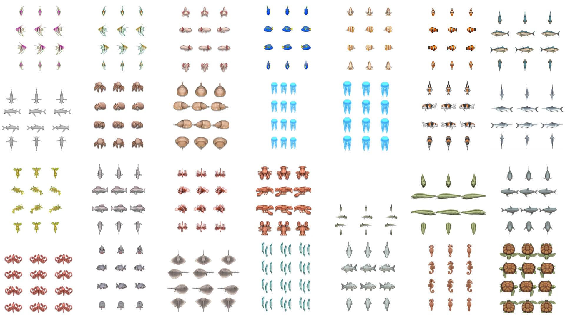 <イベントとアニメーション> ・ドア、エレベーター、エスカレーターなどのアニメーション ・噴水のアニメーション ・水中の生き物や魚のアニメーション : イルカ、ウミガメ、シュモクザメ、ホホジロザメ、エイ : エンゼルフィッシュ、アホロートル、ブルータン、チョウチョウウオ、クマノミ、鯉、リーフィーシードラゴン、オオハナダイ、ミノカサゴ、ピラニア、メカジキ、マグロ、オオカミツキダイ、スズキ : ヤドカリ、カブトガニ、ナガバガニ、エビ、タコ、クラゲ、タツノオトシゴ、ウツボ